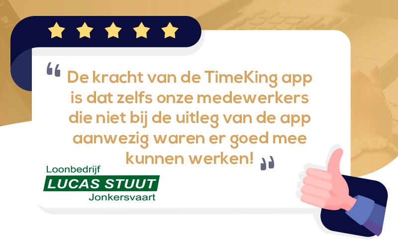 "De kracht van de TimeKing app is dat zelfs onze medewerkers die niet bij de uitleg aanwezig waren er goed mee kunnen werken!" Dat compliment kregen wij van onze klant Loonbedrijf Lucas Stuut. Erg leuk om te horen, want we kunnen zelf wel vinden dat onze app makkelijk te gebruiken is, het gaat er natuurlijk vooral om dat onze klanten dat vinden. Simpel, snel en effectief plannen en uren registreren: dat is wat TimeKing doet. En gelukkig ervaren gebruikers dat ook, al is er soms aan het begin wat weerstand!