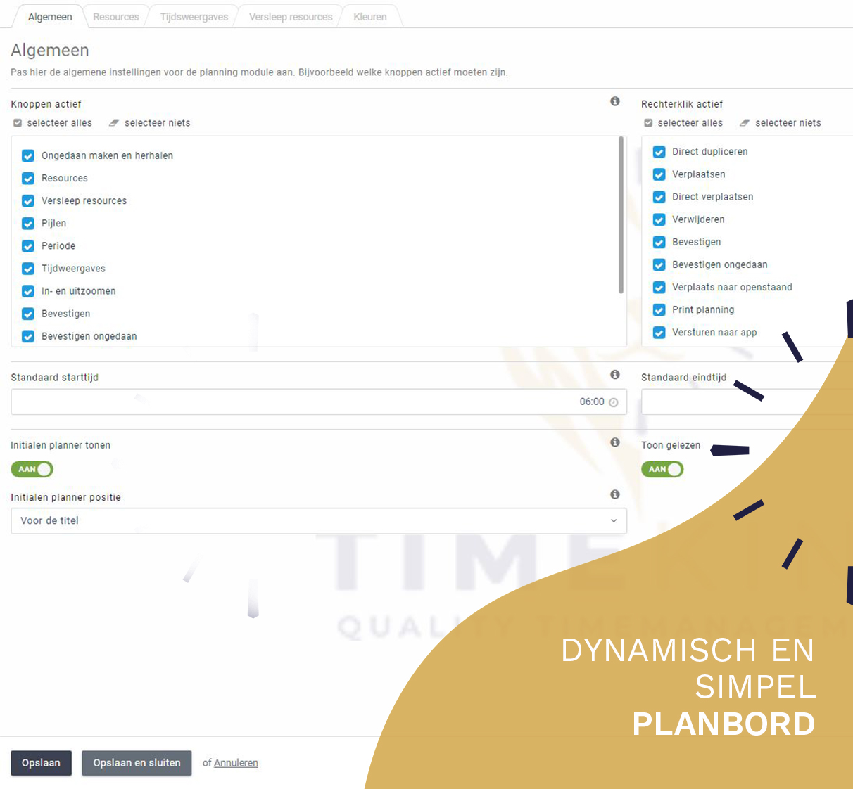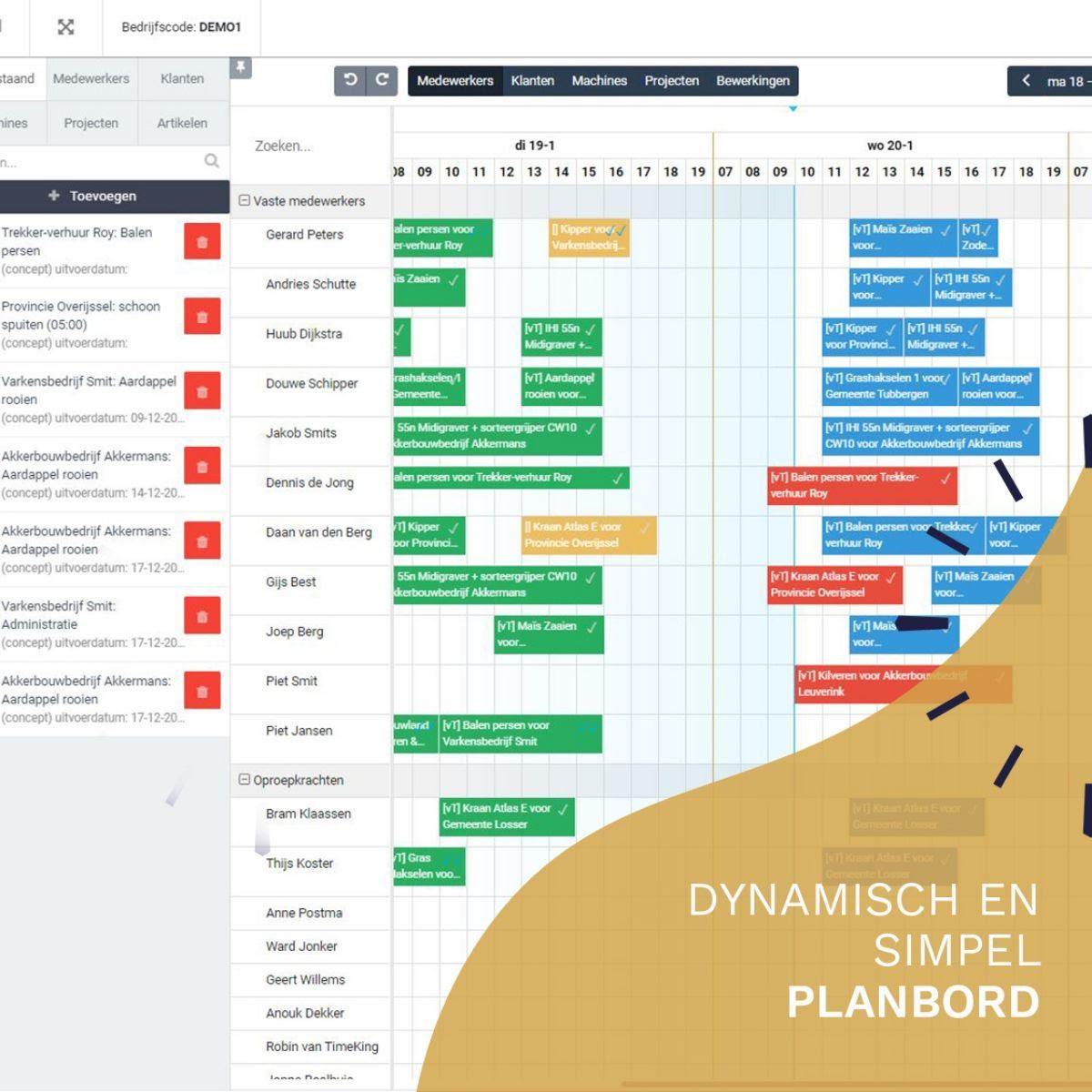 Allereerst kun je het planbord helemaal naar eigen wens invullen. Je kiest je eigen (bedrijfs)kleuren, acties en de volgorde en sortering van werknemers, klanten, machines, projecten en bewerkingen. Zo is in één oogopslag duidelijk wie waar is, welke voertuigen in gebruik zijn en welke werkzaamheden worden uitgevoerd. En mis je nog een bepaalde instelling of voorkeur? Dan maken we die gewoon!